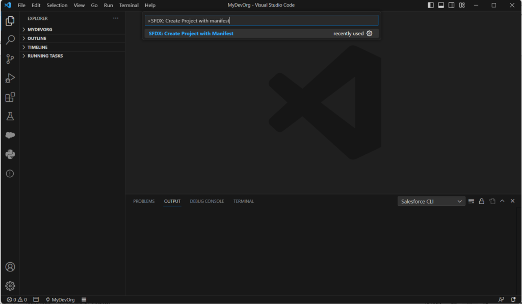 - A window will open, in the search bar type ‘SFDX: Create Project with manifest’ and hit enter.