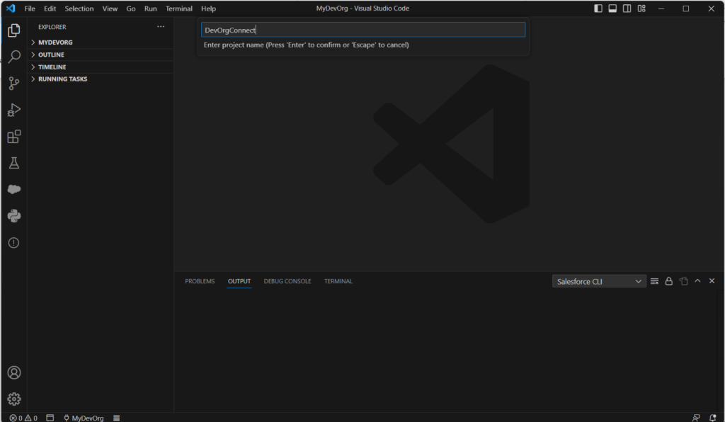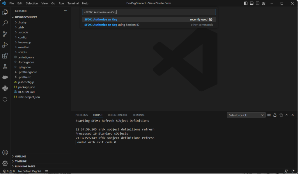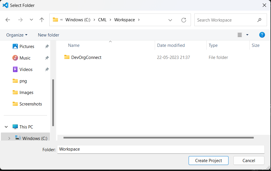 - It will now create a project called ‘DevConnectOrg’ under ‘Workspace’ folder.